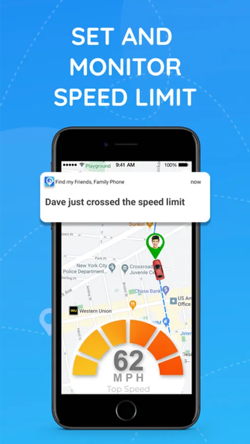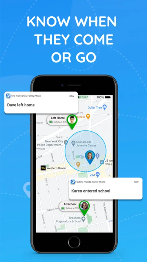 - Create safe zones, like school, home, grocery store, etc. and get notifications when your contacts leave or enter the zone.