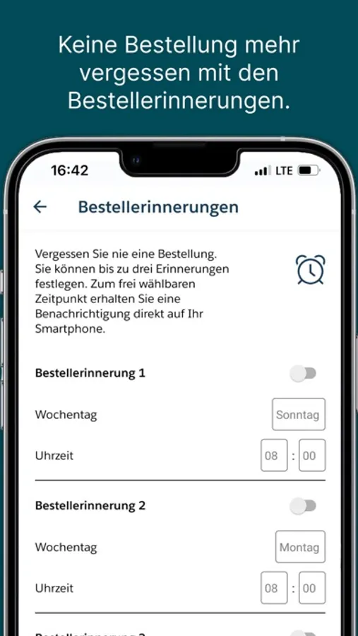 Kleine Erinnerung gefällig? Ganz nach Ihrem Bedarf können Sie bis zu drei Bestellerinnerungen pro Woche aktivieren. Sie wählen Wochentag und Uhrzeit. Wir erinnern Sie mit einer Benachrichtigung auf Ihrem Smartphone.