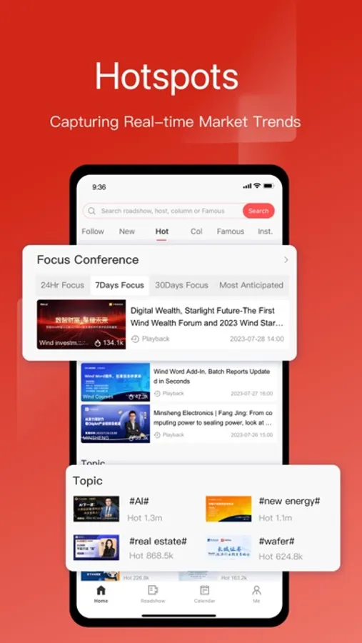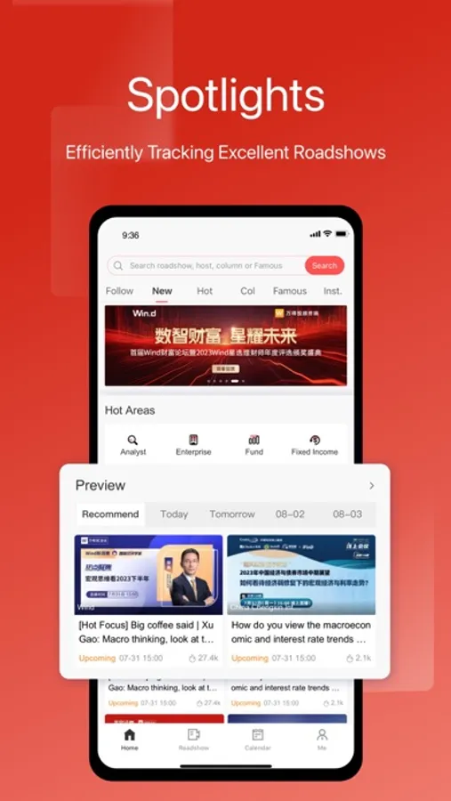 More than 5000 securities research institutes, futures, funds, banks, insurance, listed companies, financial universities, intermediaries and other financial institutions have now settled in Wind 3C Conference, covering 40+industry fields, industry research, financial training, product roadshows... everything. 10000+financial celebrities and industry experts are specially invited to participate in regular online roadshows, and come and communicate with 3 million financial people online!
