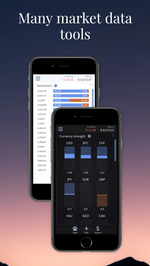 Keep track of market movements using a heat map of major changes, a display of relative currency strength, and real-time long/short sentiment based on real-money trades by FX Blue users.