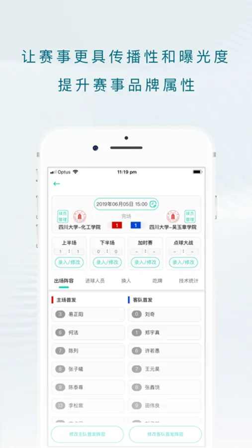 移动版比赛数据录入管理工具:球队数据|球员数据|对比统计,移动端数据录入(阵容,进球,助攻,进球类型,换人,持牌,赛事技术统计等),让比赛技术统计更加专业和便捷。