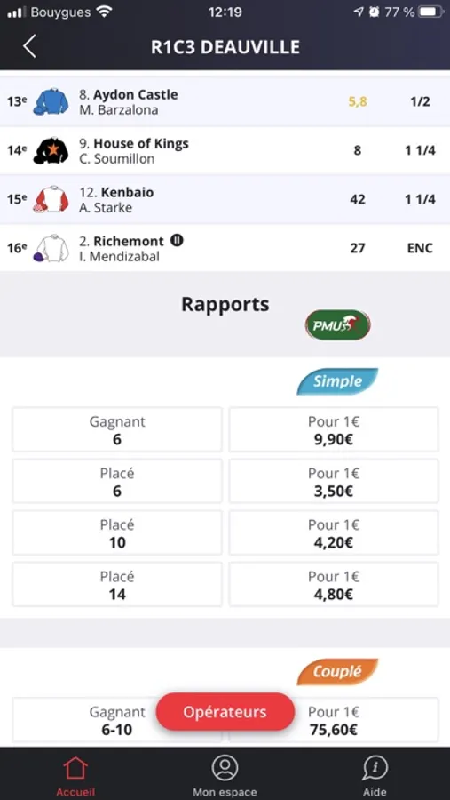 Avant le départ, soyez informé des cotes du PMU en ligne et du PMU points de vente en simple gagnant et consultez les interviews. Après la course, consultez les rapports du PMU en ligne/points de vente de chaque pari (simple gagnant, simple placé, couplé gagnant, trio, super 4, multi, tiercé, quarté, quinté, pick5).