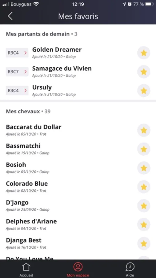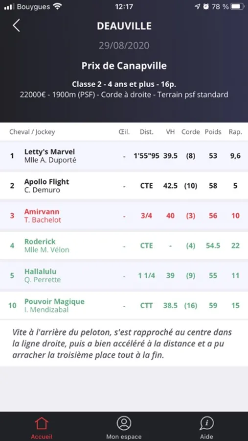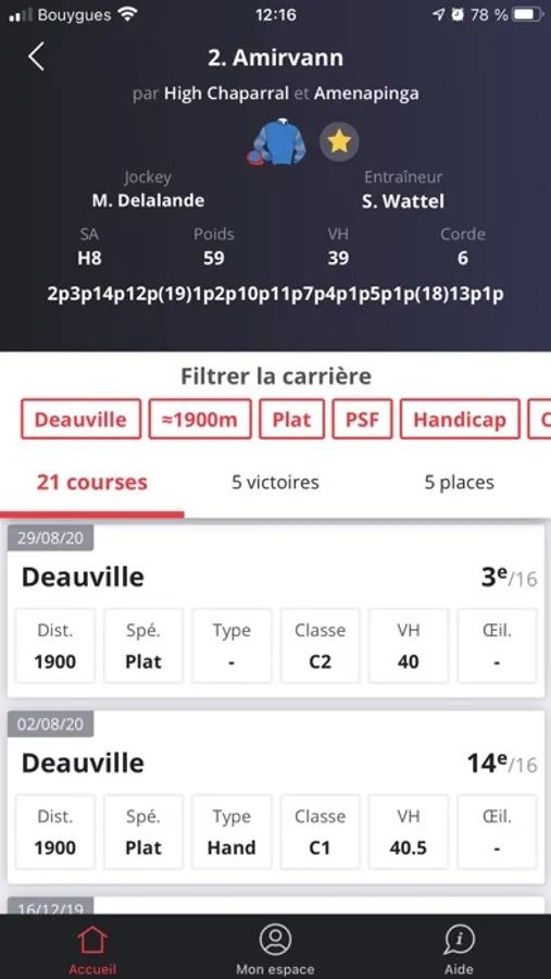 Approfondissez en ouvrant une fiche cheval : toutes les performances de la carrière sont listées.