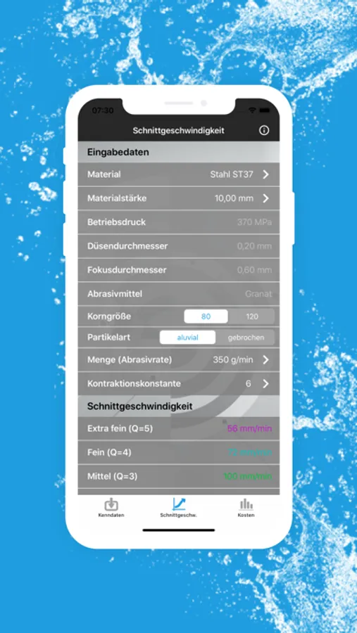 Area 2 is used to determine the material-specific cutting speeds. This is based on individually adjustable operating parameters, such as operating pressure, tool diameter, and the type and amount of the abrasive material. The cutting speeds are output for a number of quality levels.