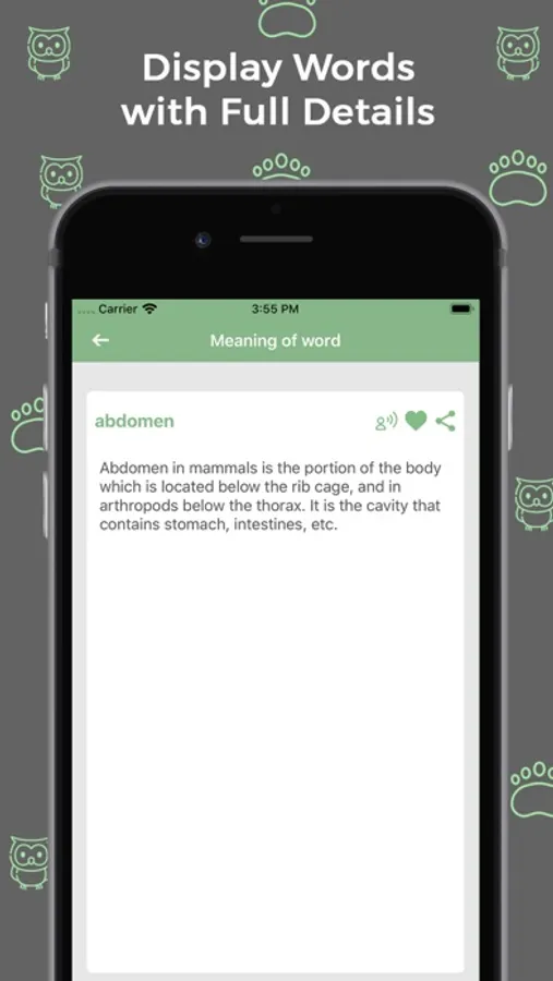 - Want to save a word meaning in the favourites? Tap the heart button and we will add this word automatically in your favourites. You can easily access to it anytime within the favourites choice in the options menu.