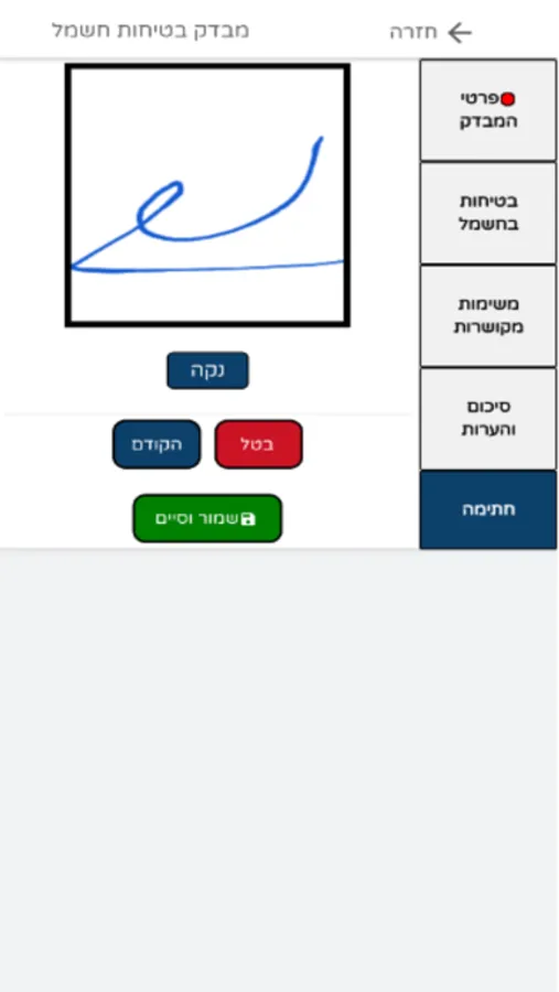 ניהול מבדקים: ביצוע מבדקים מהאפליקציה ושליחת טופס המבדק חתום כקובץ למייל כולל מבדק עוזר בטיחות באתרי בניה.