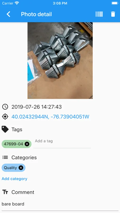 Quality Assurance - capture images of damaged or defective goods. Scan the product barcode, set category to Quality. Capture pictures of damage.