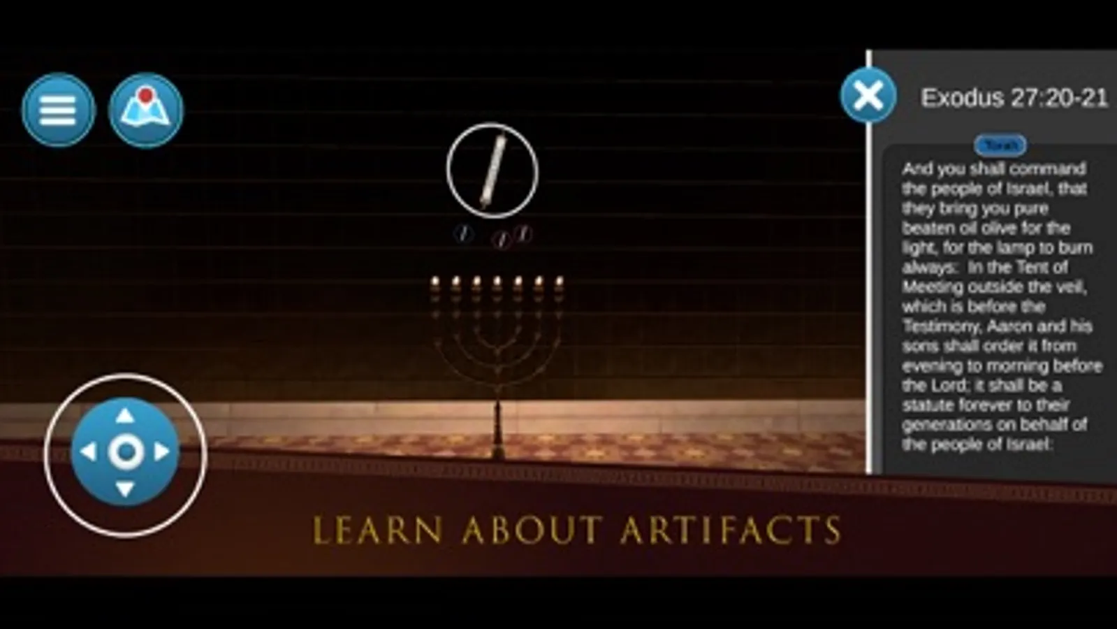 Because this is a 3D scene, you have complete freedom to explore every detail. Pinch to zoom, rotate the camera, use the interactive joystick to view the structures from different angles, use the jump arrow to more easily navigate the stepped terrain, and enjoy an aerial map view to give you a better perspective of ancient Jerusalem and the various locations you can explore and interact with through the app.