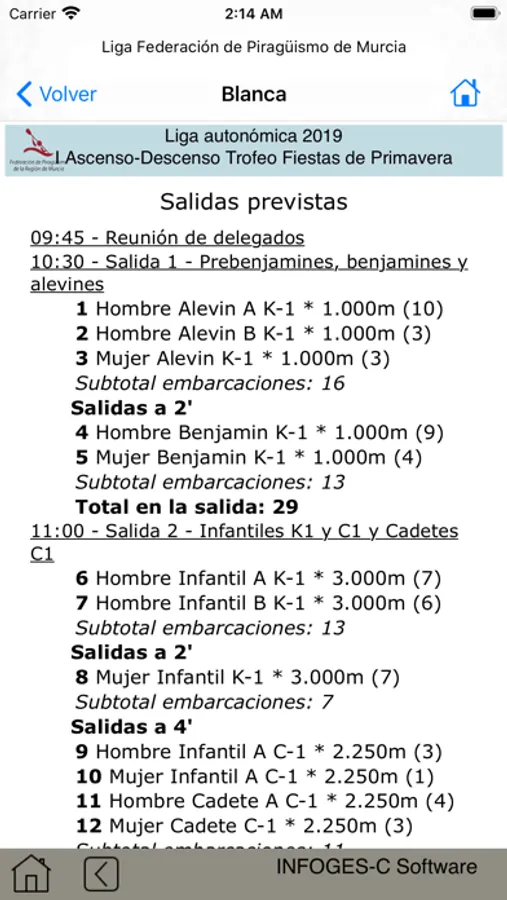Resultados y clasificaciones de las pruebas incluidas en cada regata.