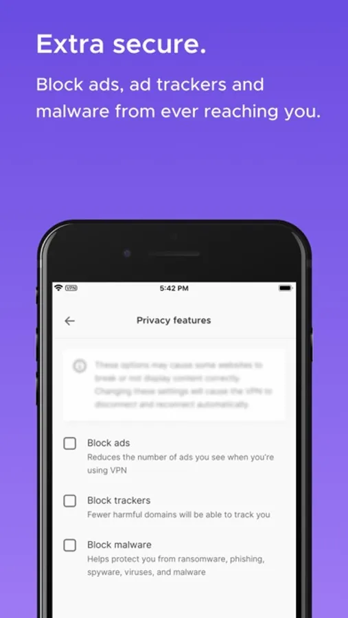 When you are connected to the Mozilla VPN, you can choose to route your traffic via two different locations - called multi-hop - and add ad, ad trackers and malware protections. Peace of mind with a click of a button