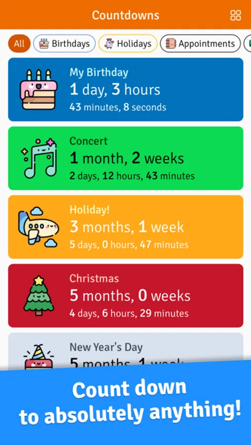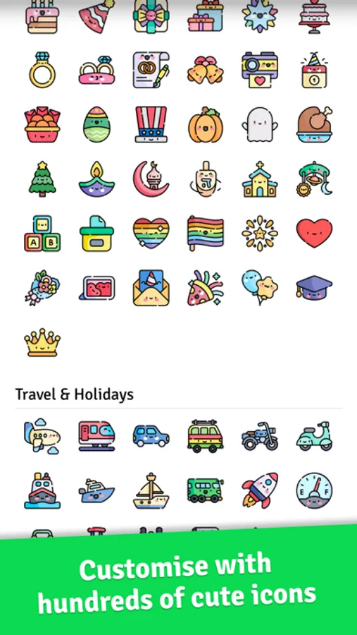 You can customise your countdown with hundreds of cute icons, so you can always find a perfect match for your countdown. Countdown to Anything has icons for birthdays, holidays, weddings, baby due dates, parties, movies, games, books, appointments and lots more!