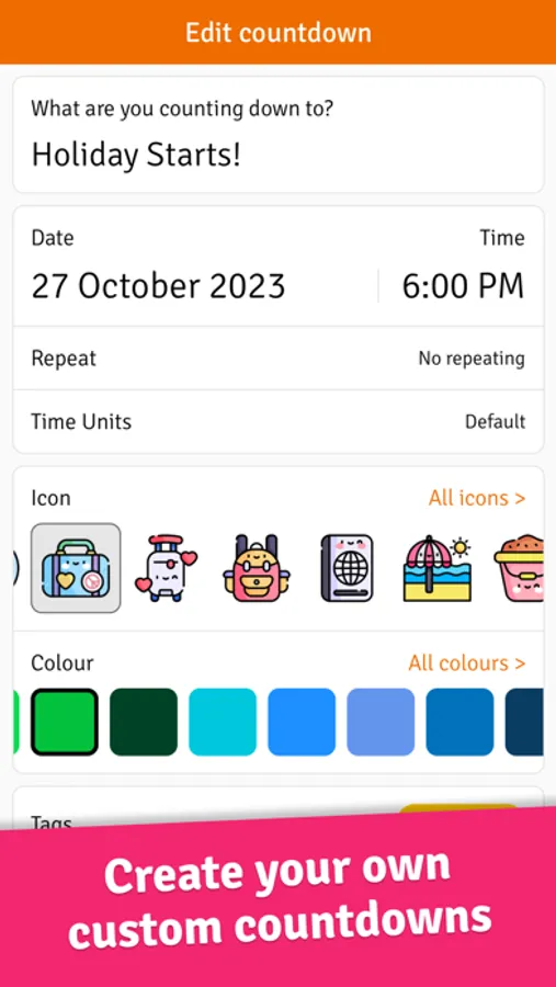 • Got lots of countdowns? Add custom tags to them so you can see similar countdowns at once. Try creating a "Birthdays" tag!