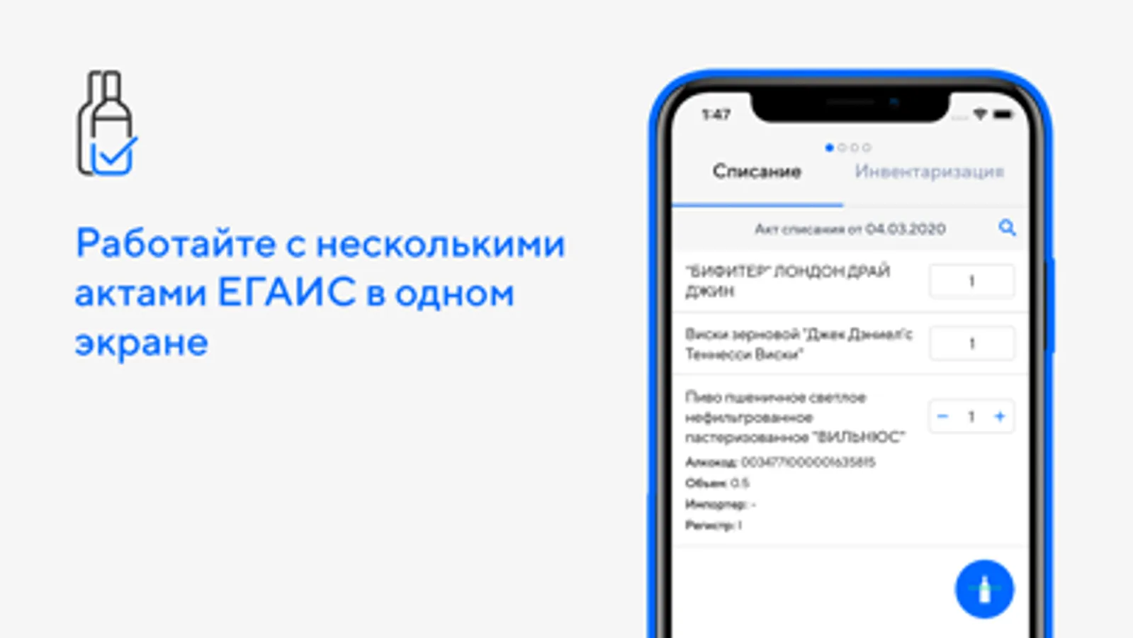 - списывать, делать возврат и перемещение алкоголя по актам ЕГАИС,