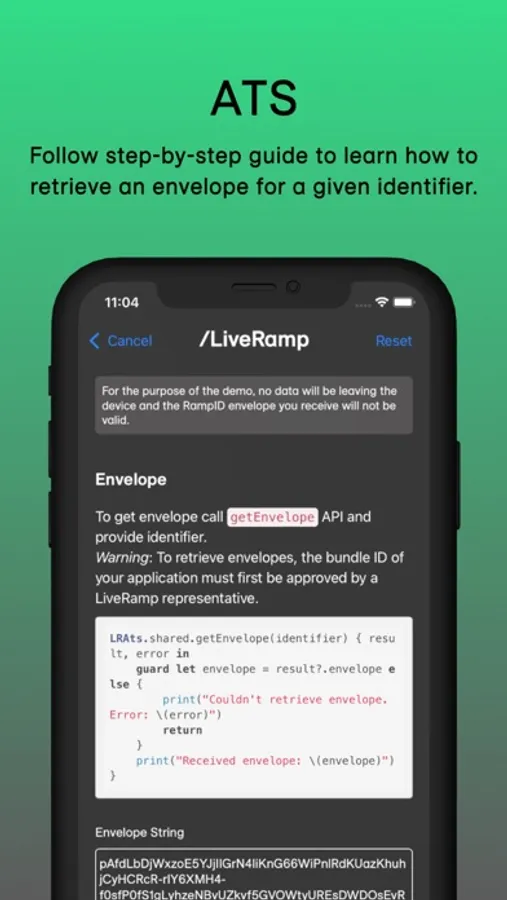 With the LiveRamp Guide app, users can test the workflow of the SDKs and conduct a demonstration of ATS and TCF (GDPR) SDK in a few simple steps. For the ATS Mobile SDK demo, no data will be leaving the device and the RampID envelope users receive will not be valid. Users can also learn more about the Mobile SDKs products and easily access the help documentation via the provided tiles on the LiveRamp Guide app.