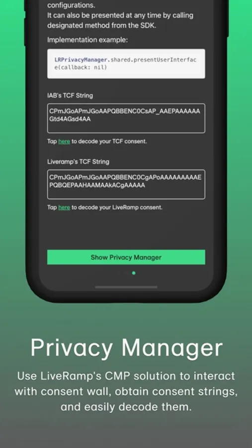 • Privacy Manager GDPR Mobile SDK: LiveRamp’s Consent Management Platform (CMP) for mobile apps which enables app owners to manage consent to be compliant with the GDPR