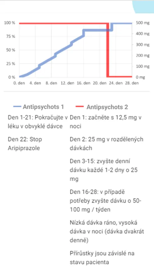 Aplikace zobrazuje doporučené dávkování jednotlivých účinných látek při změně terapie u pacienta léčeného určitým antipsychotikem nebo antidepresivem.