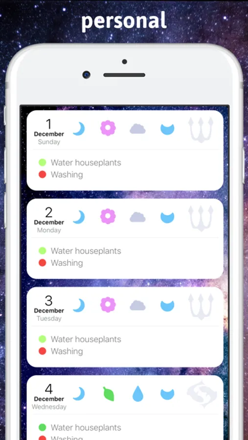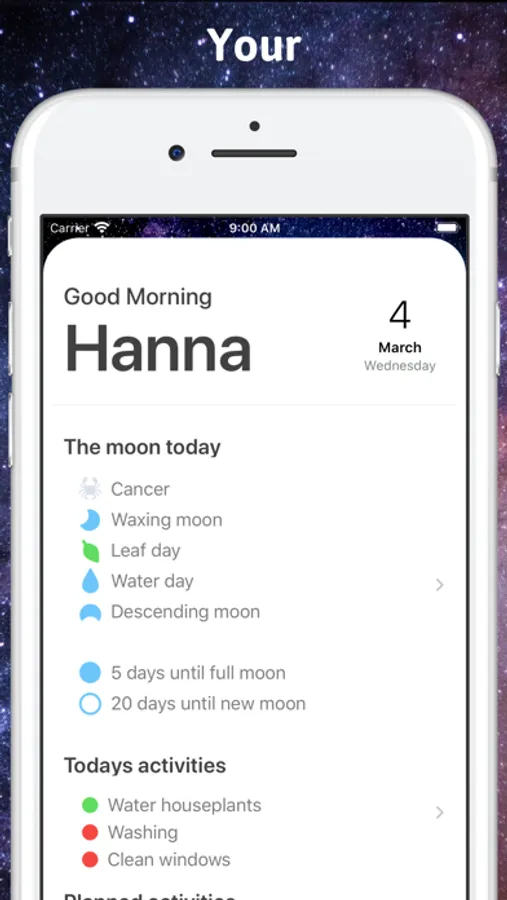 Additionally it shows you the detailed effects of the moon in 4 categories: Effects on your personality, Health, Household and Garden, Relationship & Business.