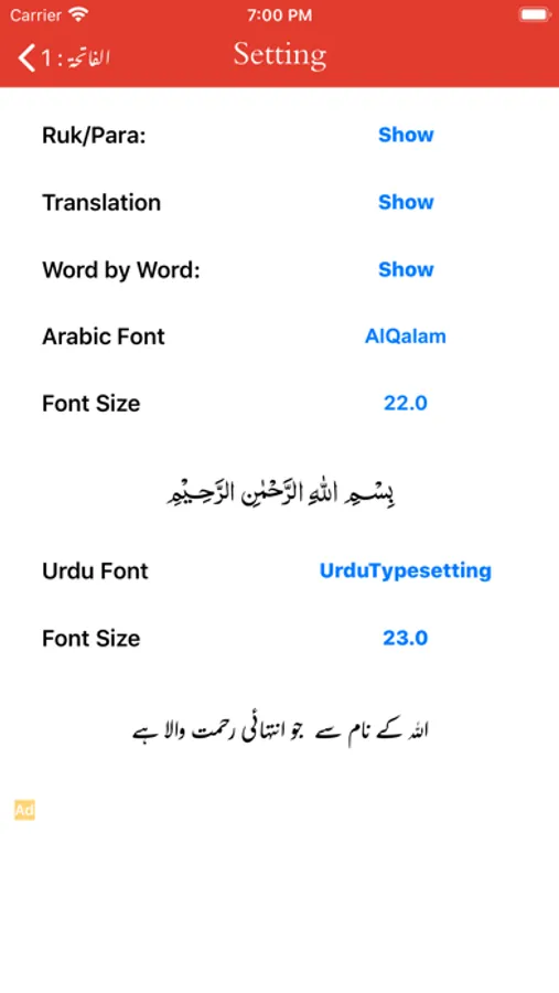 - Ability to show/hide Word by Word, Quran Translation (Tarjuma)