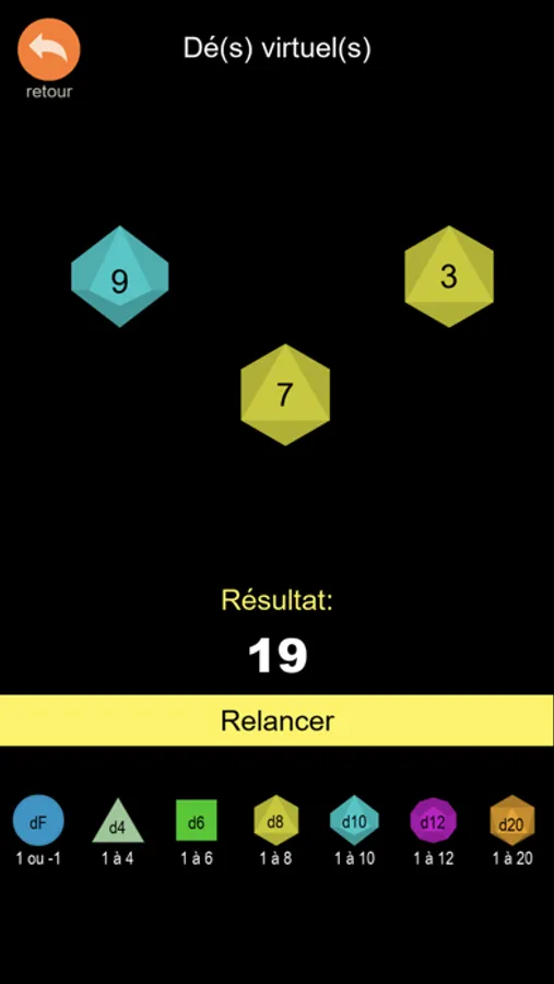 _ Virtual dice, a random dice generator launcher, the available dice dF, d4, d6, d8, d10, d12, d20 to cover most role-playing games and board games, including automatic detection of yahtzee/yams for a rolled with 5 6-sided dice.