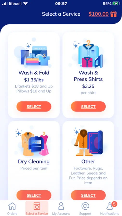 Step One: After you download the mobile app, pick what service you want (dry cleaning, clean and fold, etc.).
