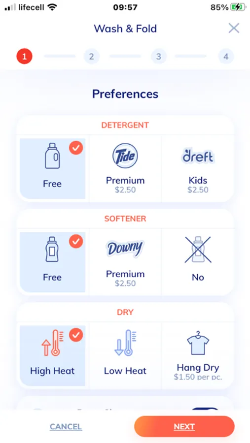 Step Two: Select your preferences for detergent, fabric softener, dry temperature, and other laundering add-ons.