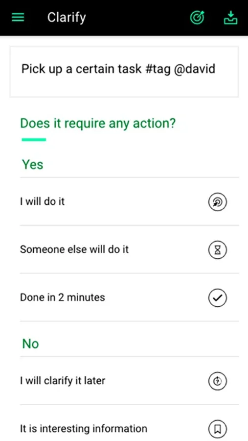 It allows you to follow the GTD five-stages workflow method to deal with our work: