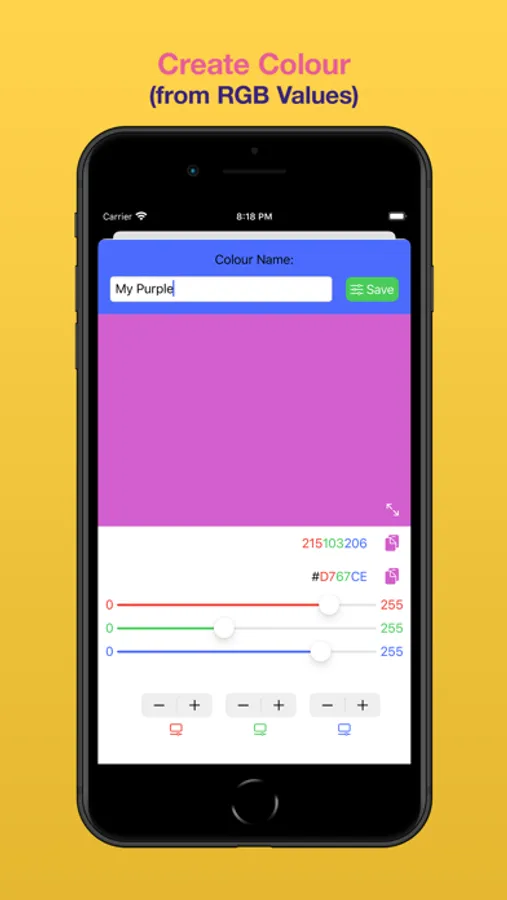 Move the RGB sliders to create the color you want and save for later. Stepper controls allow for fine adjustment, if needed.