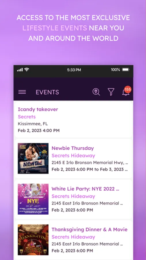 Fantastic events beyond your wildest imagination are a big part of the Lifestyle. Quiver works hard to curate the best swinger’s events around the world and gives you access to them directly within the app. You can search by location, type, theme, and attendees, and RSVP directly in the app!