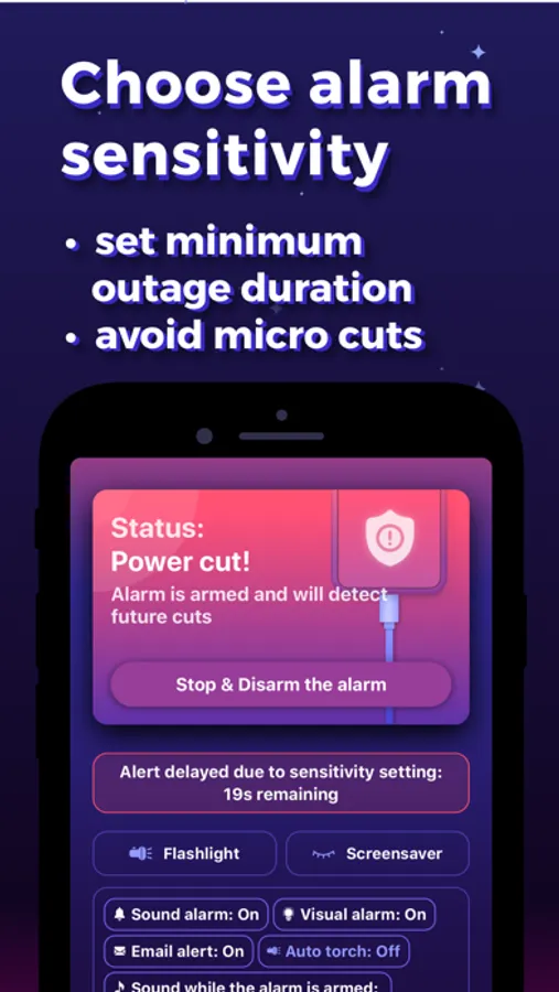 Control the alarm sensitivity to choose how long an outage takes before the alarm goes off to avoid detecting power blips.