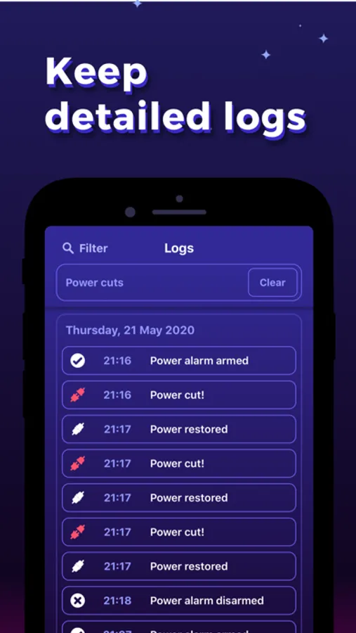 The app monitors both power cuts and restorations, and provides comprehensive logs which you can sort and filter, so you can avoid unpleasant surprises and take control.