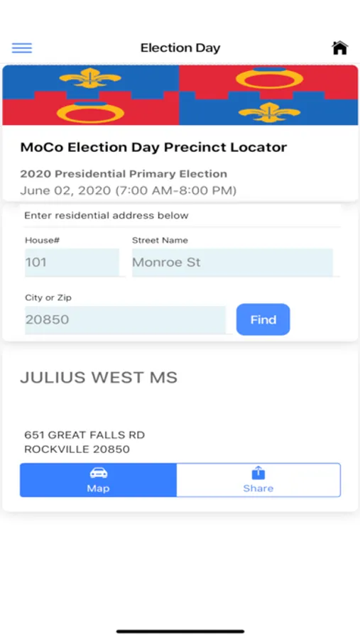 The app helps the citizens find their correct election-day voting precinct by their addresses.