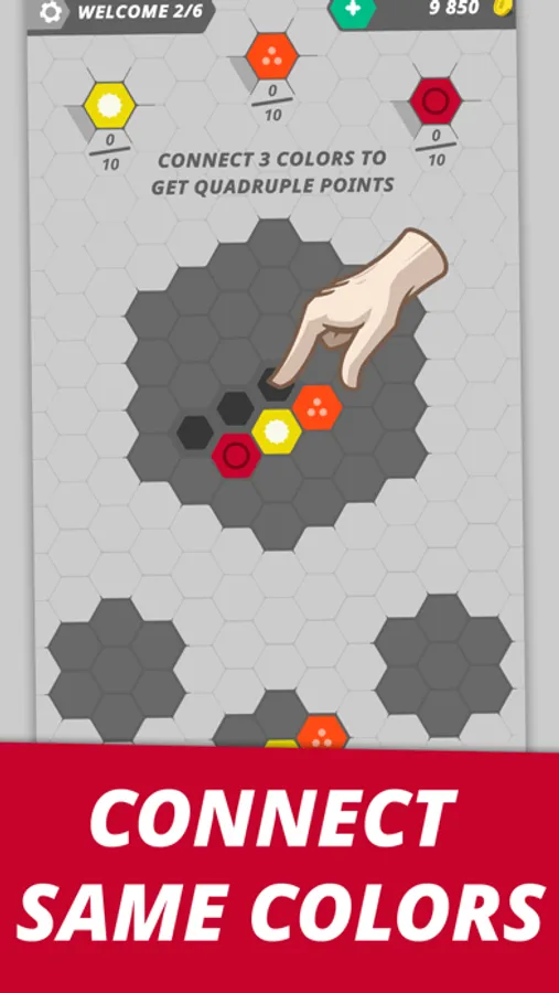 The simple goal of the game is to connect three different hexagonal elements of each type in order to get as many points as possible!