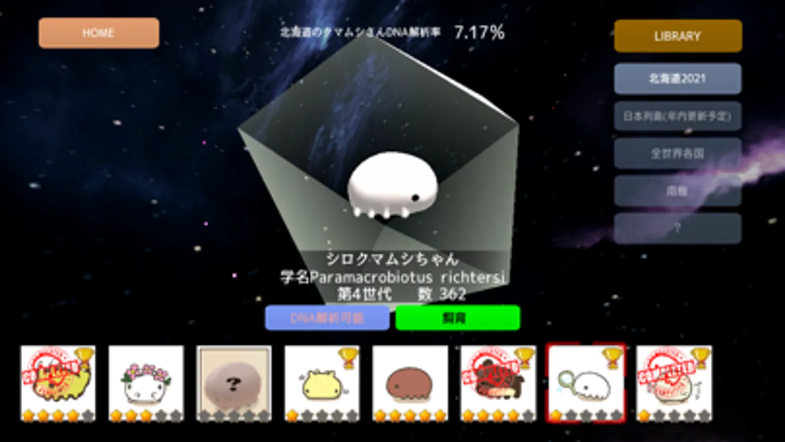 この最強のゆるキャラの謎を解き明かし、地球最後の日を乗り越え、人類の宇宙進出を目指しましょう。クリプトビオシス(隠された生命)、パンスペルミア(胚種広布)説。元NASAのクマムシ研究者の協力を得ながら開発さた本格クマムシ研究エンターテイメント。世界の、そして宇宙のクマムシさん全系統確立を目指して、カジュアルなのに壮大なクマムシ研究者の物語が始まります。第一章は北海道編。今後、日本全国の都道府県、世界各国、南極、そして月・・・と続いていく予定です。