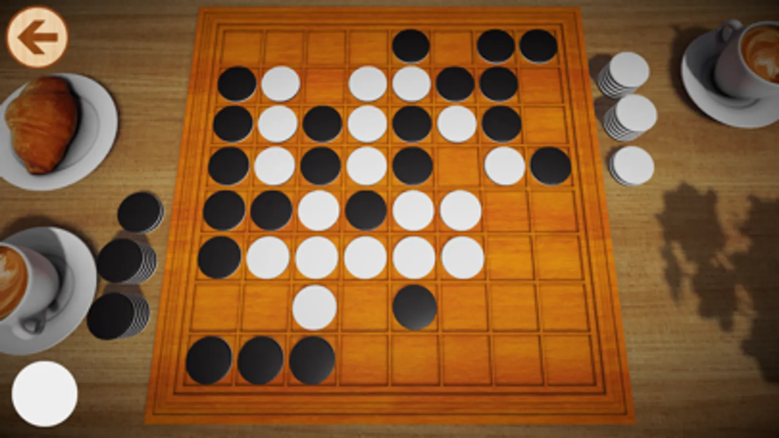 This game uses the same rules as othello and is similar to reversi. Each player takes turns to place down a disc in an empty position, where at least one opponent's disc can be captured and flipped over. An opponent's disc can be captured if it is in between the newly placed disc and another disc of the same color. This can be horizontally, vertically and diagonally. When a player can't make any valid moves, they skip their turn. The winner is the player who has the most discs flipped over to their color, at the end of the game. The circle in the bottom left corner indicates which player is currently making their move.