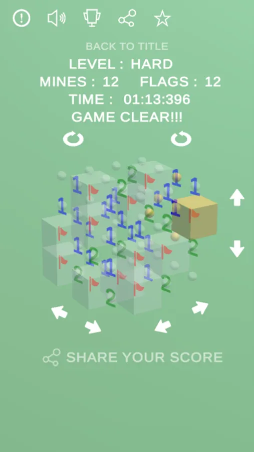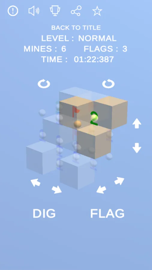 Basic operations are the same as the normal minesweeper, but the number represents the "number of mines in the adjacent cubes (up, down, left, right, front, back)". Be aware that cubes touching only by corners or sides are not included in the count.