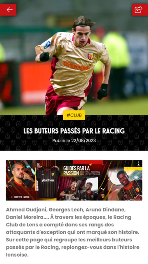 Toute l'actualité du Racing à portée de main ! L’application vous offre aussi la possibilité de télécharger vos billets pour les matchs à Bollaert-Delelis, de jouer en vous mettant dans la peau du coach ou encore de tester votre culture lensoise en répondant à des questions sur l’histoire du club.