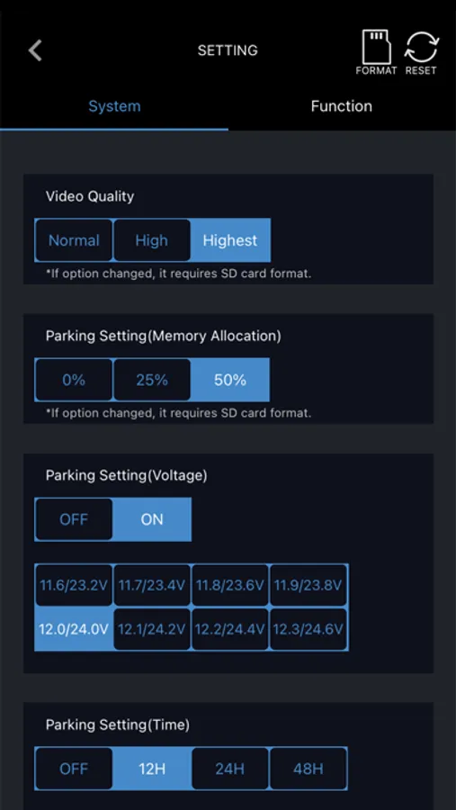 - Dashcam Setting : Can set system and function options as video quality, time, and etc.