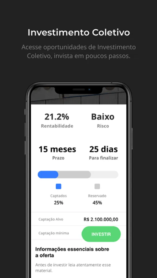Acesse oportunidades de Investimento Coletivo com um clique, leia todas as informações necessárias para tomar uma decisão e invista direto pelo aplicativo.