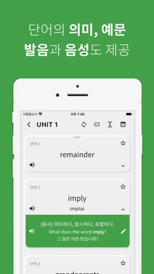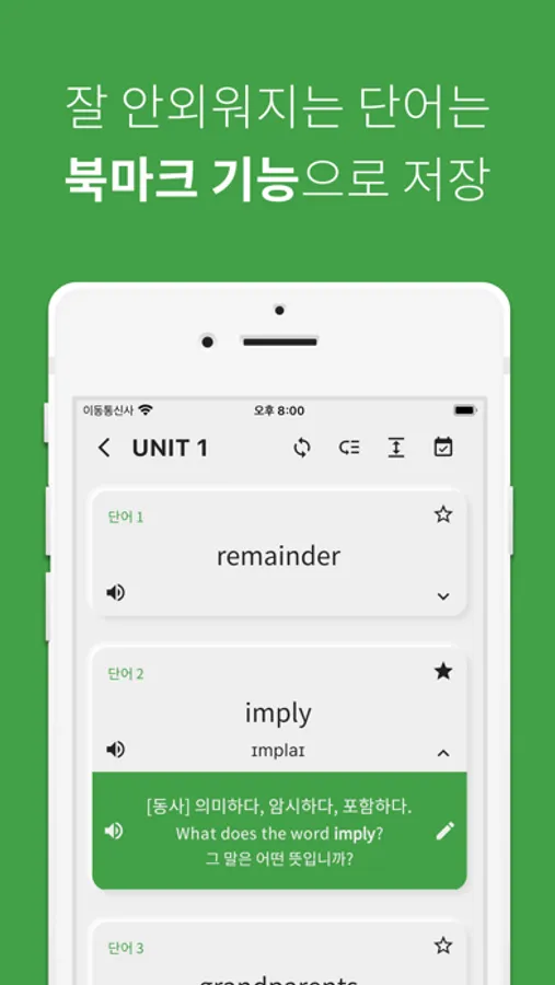 - 파트별, 유닛별, 전체 중고등 영어 단어를 복습하는 기능 제공