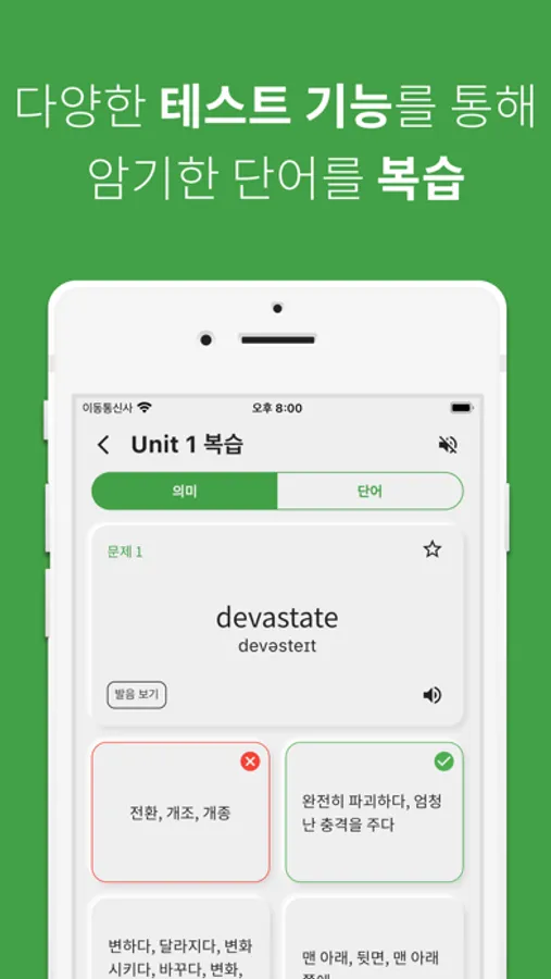 단어 공부는 역시 반복이죠! 공부한 중고등 영어 단어를 파트별, 유닛별, 전체 단위별로 복습할 수 있습니다.