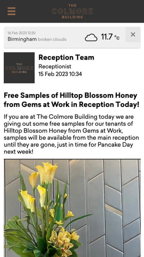 The Colmore Building keeps you in touch with your colleagues and working community. Access to social features through a scrollable “Social Wall” keeps you up to date with your colleagues, while in-app messaging is available from the “Chat” section. Occupants can look at real-time local events, amenities and offers to see what’s going on outside of the office.