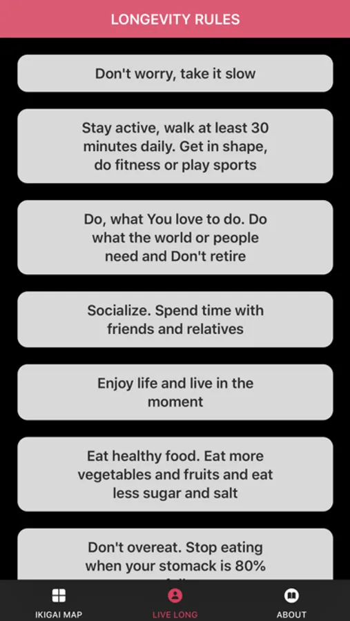 The app contains some Longevity tips that can help in improving life quality. Check the rules and share them with friends.