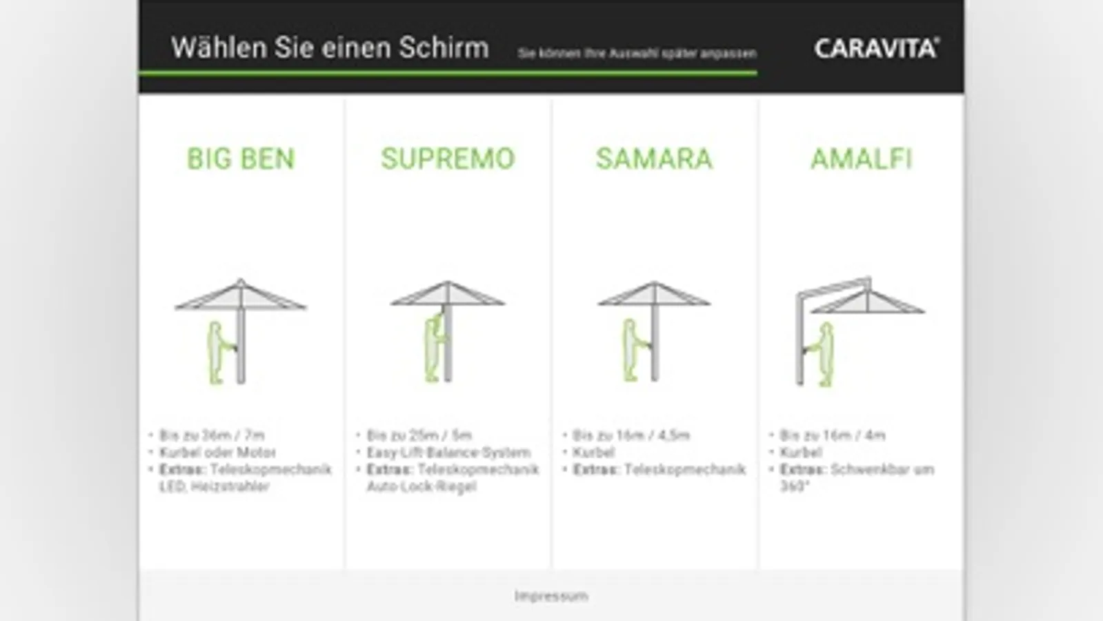 The CARAVITA AR Designer is your configurator for the virtual planning of your parasol. Using the Augmented Reality App, BIG BEN and Co. can be easily configured and visualised at your personal at your personal place of use.