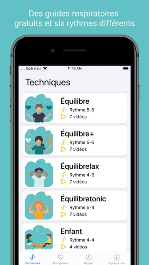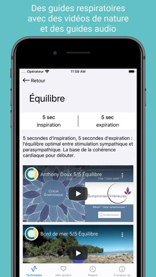 Variez votre pratique avec les nombreux guides offerts sur des vidéos inspirantes de scènes de nature. Vous pourrez choisir entre 6 rythmes respiratoires :