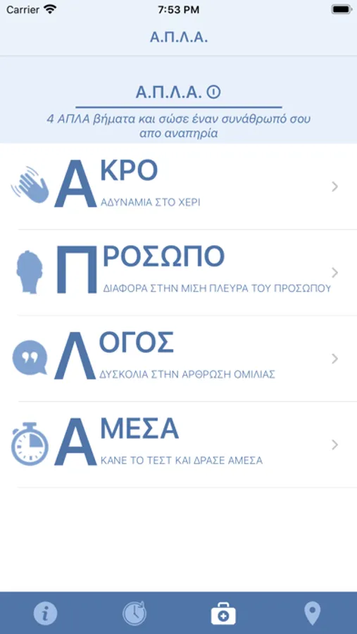 Η εφαρμογή ΑΠΛΑ είναι το πρώτο εργαλείο στην ελληνική γλώσσα για τον προσδιορισμό των συμπτωμάτων ενός πιθανού εγκεφαλικού και το πρώτο που καθοδηγεί γρήγορα τον ασθενή με εγκεφαλικό για τη λήψη θρομβολυτικής θεραπείας.