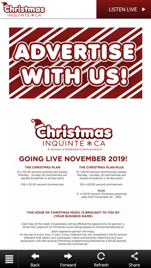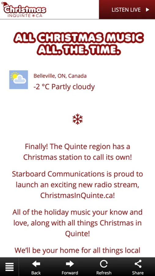 Finally! The Quinte region will have a Christmas station to call its own! Starboard Communications is proud to launch an exciting new radio stream, ChristmasInQuinte.ca! All of the holiday music you know and love, along with all things Christmas in Quinte! We’ll be your home for all things local when it comes to the holidays this season! When and where are the Santa Claus Parades are happening? What events are available to you and your family over the holidays? What does the holiday weather forecast look like? Everything Christmas, everything local! Welcome to the all-new, ChristmasInQuinte.ca! All Christmas Music. All the time.