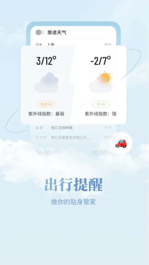 【贴心的出行提醒】根据用户上下班时间及地点,为用户提供上下班沿途的精准天气数据