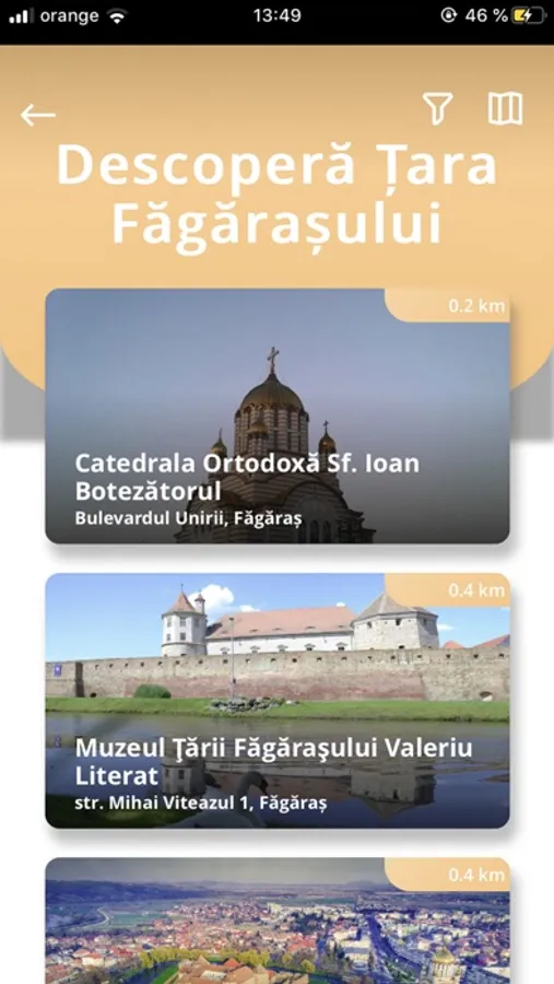 Toate elementele pot fi sortate alfabetic sau dupa distanta. De asemenea, se pot folosi optiuni de filtrare, in functie de tipul de punct de interes.