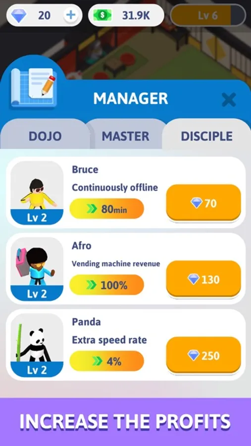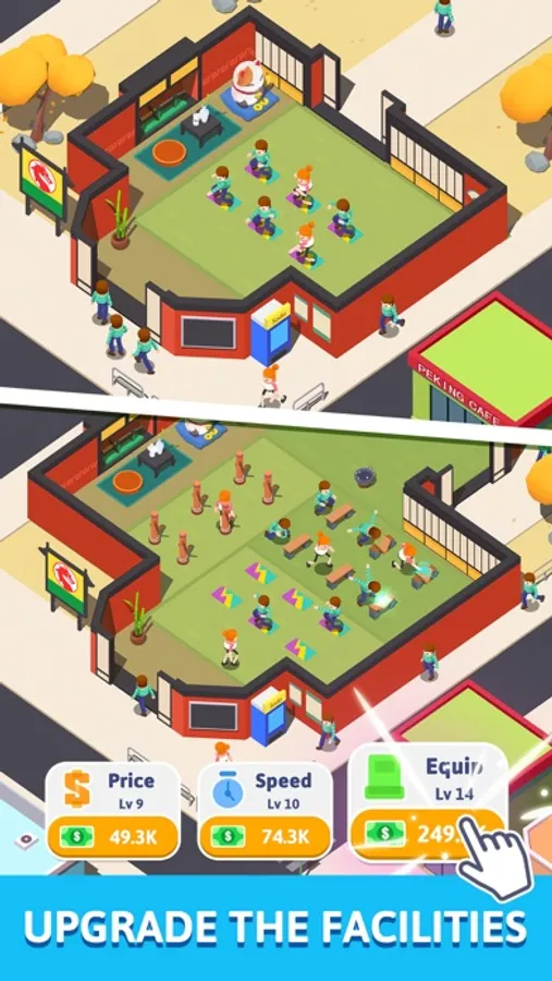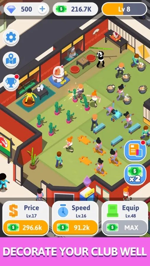 As the room is getting more and more crowded, you can enlarge your club and space. And when you get enough money, you can upgrade your items, reduce the members learning time for more profits and increase the price even. Unlock new members and teachers after you level up.