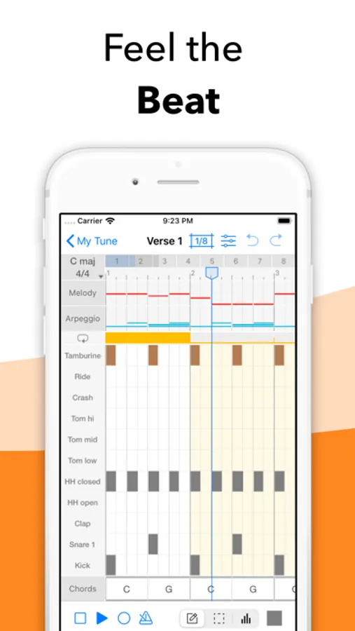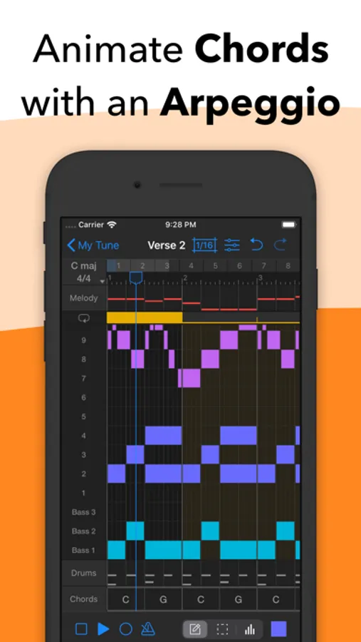 In Tune Maker, an arpeggio track is a rhythmic pattern for your chord progression. You can think of it as a right hand pattern when you play on a guitar. It can be like strumming, bass & chord or a single-note pattern. Tune Maker automatically maps this pattern to your chords and produces appropriate note pitches.